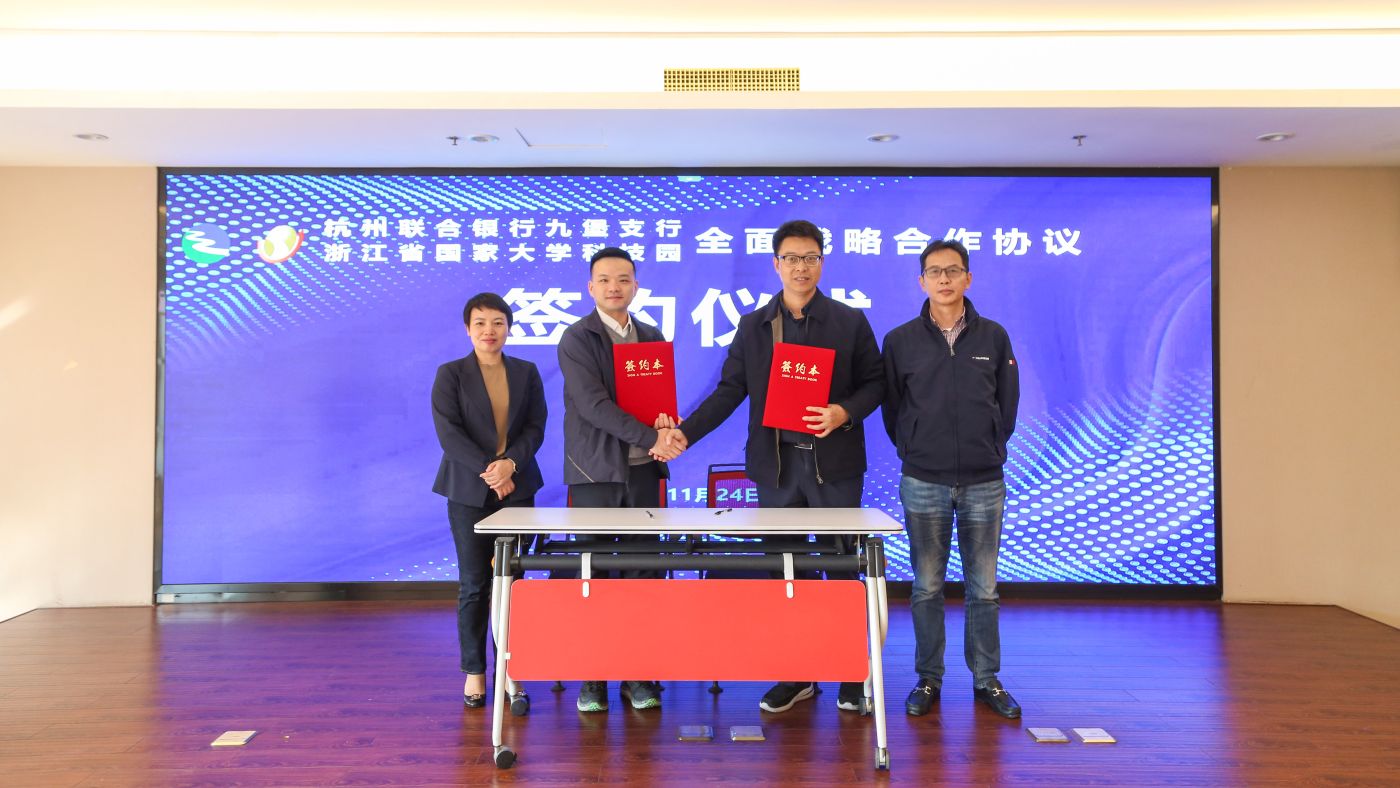 11月24日,浙江省国家大学科技园与杭州联合银行九堡支行举行战略合作签约仪式,结成全面合作战略伙伴。杭州联合银行九堡支行行长奚涛、副行长陈淑君,科技园副总经理钱佩忠、陈根宝等出席签约仪式。