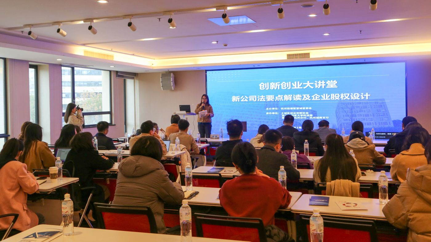 2023年底,我国《公司法》经历了一轮全面修订。为帮助企业及时理解新公司法对企业带来的影响,助力企业优化股权设计及治理结构,了解企业在发展过程中能享受到的政策及科创金融优势产品,近日,由杭州钱塘智慧城主办,浙江省国家大学科技园、上城区创业创新协会、南京银行杭州分行联合承办的创新创业大堂——新公司法要点解读及企业股权设计在科技园顺利举行。科技园内外近40位企业代表参加本次活动。