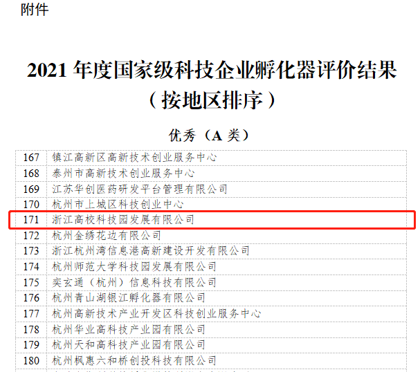 近日,科技部火炬中心关于国家级科技企业孵化器2021年度的评价结果新鲜出炉。通过数据和总结上报、定量计算评价、专家定性评价和地方管理评价等各项程序,386家国家级科技企业孵化器被评为优秀(A类),617家被评为良好(B类),262家被评为合格(C类),12家被评为不合格(D类)。浙江省21家国家级科技企业孵化器获评优秀(A类)。其中,园区运作主体浙江高校科技园发展有限公司在年度评价中获得优秀(A类)的成绩,这是科技园在七年考核中第六次获评优秀(A类)。