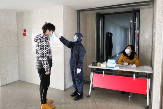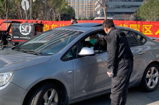 园区大门口保安检测进园人员体温