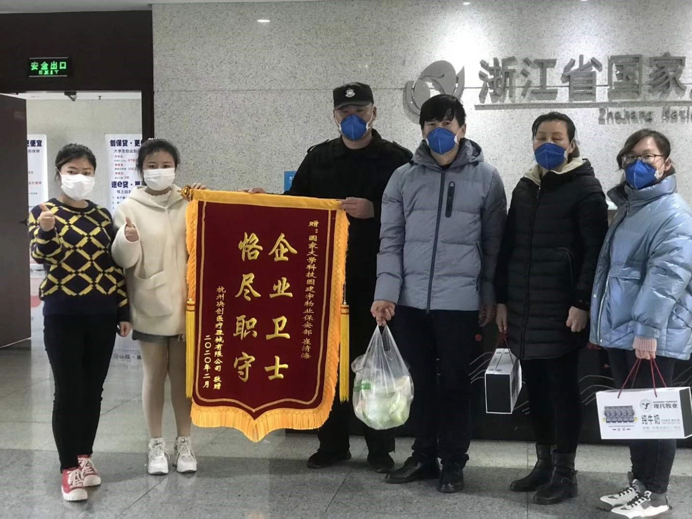 2月24日,杭州决创医疗器械有限公司感谢崔清海的善举,买了慰问品还特意做了一面 “企业卫士 恪尽职守” 的锦旗送给物业保安部。园区保安部用实际行动诠释了在平凡岗位上恪尽职守、乐于助人的品质,于点滴中感动着园区创业人。一路有你们护航,我们由衷感谢,你们辛苦了!